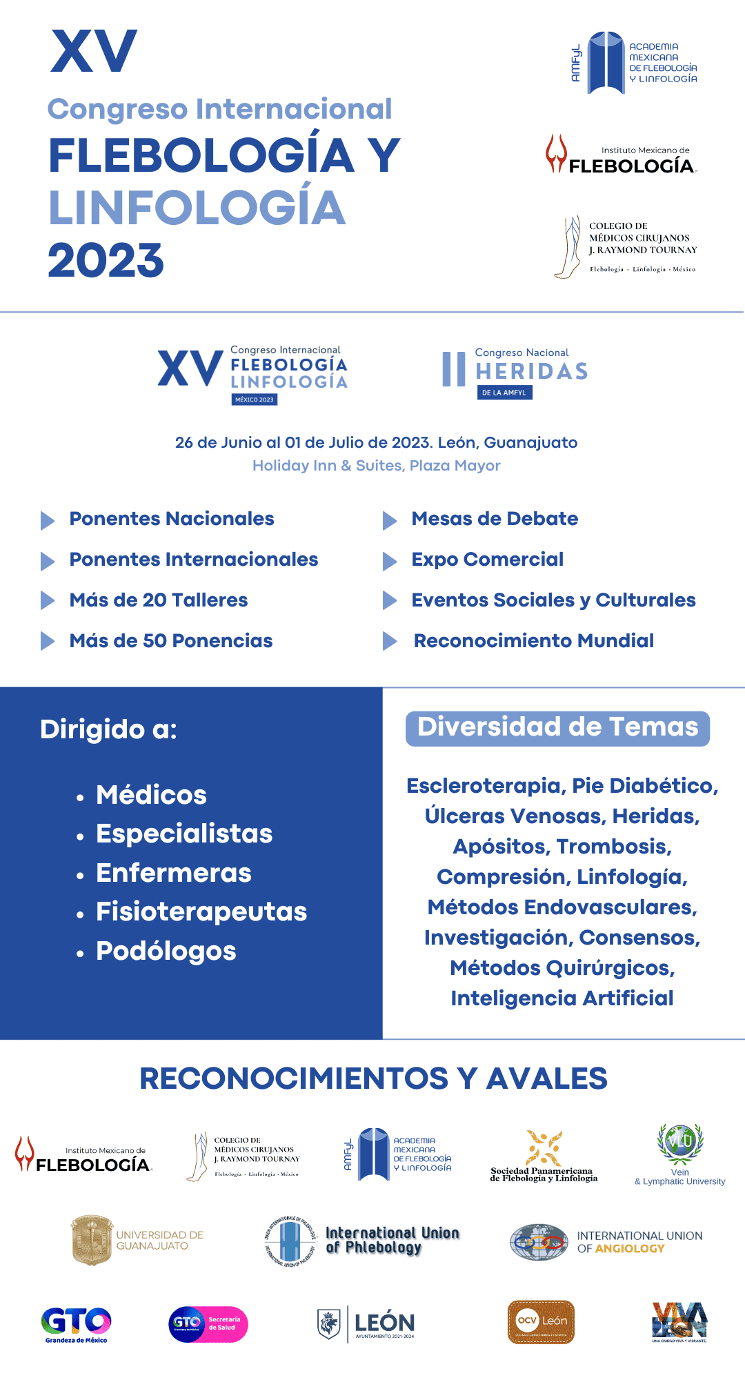 No pierdas la oportunidad de ser parte de este evento de talla internacional, donde destacados expertos compartirán sus últimas investigaciones y técnicas innovadoras. Únete a la familia flebológica mexicana y sé parte del rugido del Bajío en nuestro próximo congreso internacional de flebología y linfología. Juntos, continuaremos innovando y mejorando la calidad de vida de quienes padecen enfermedades venosas y linfáticas.