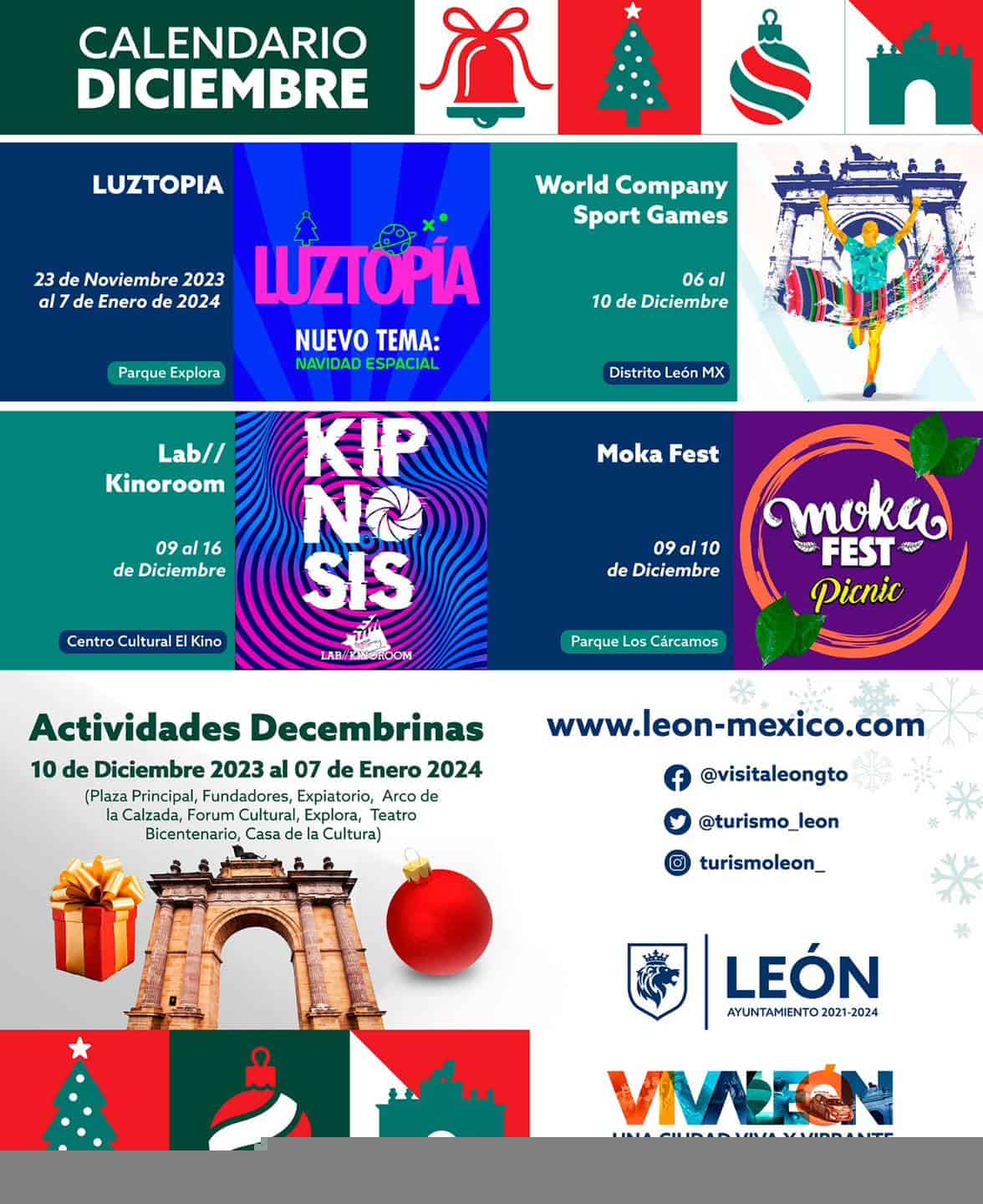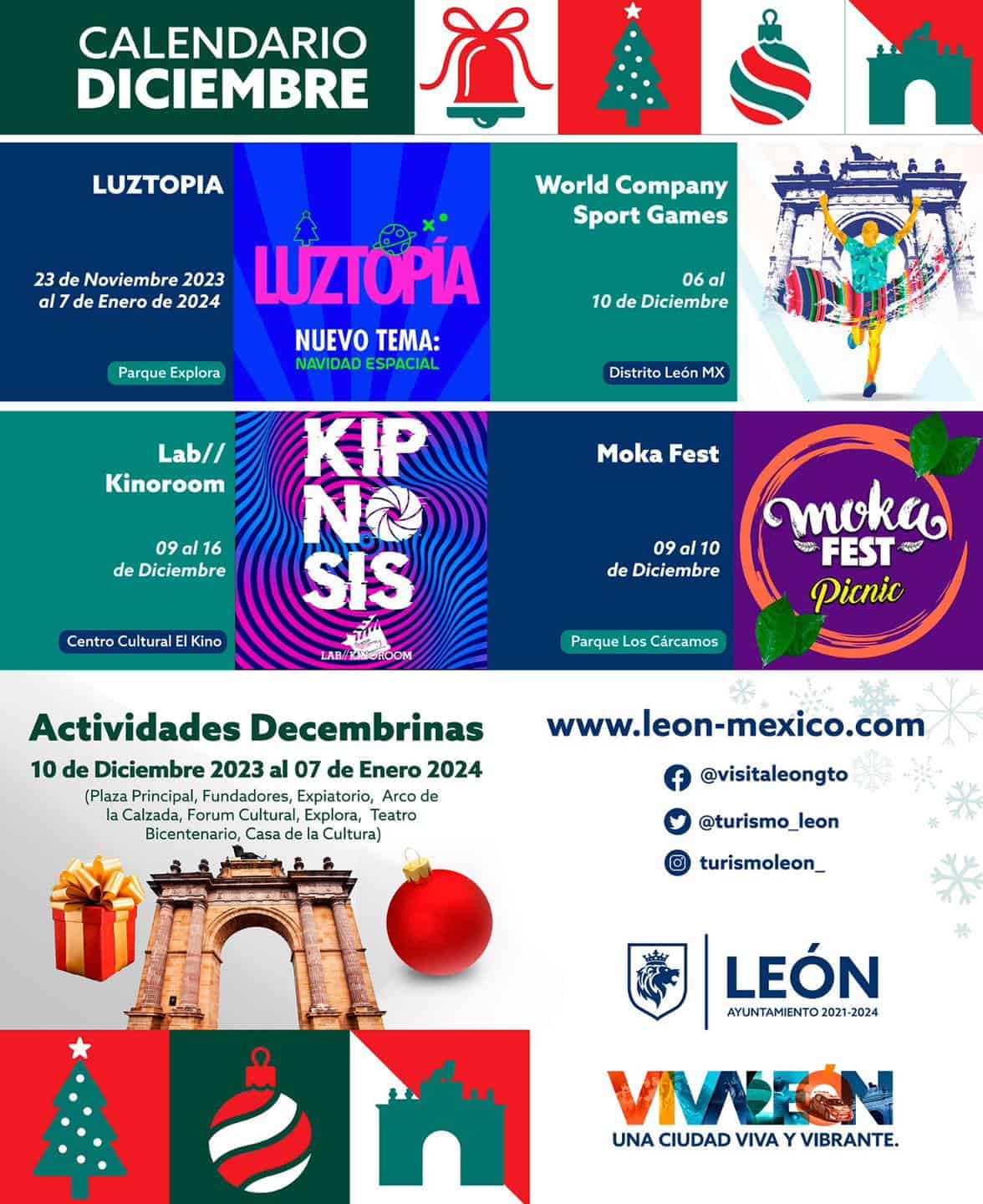 ¡Disfruta de los últimos días de las decoraciones emblemáticas en #León! Te esperamos en el corredor turístico Forum Cultural, Calzada de los Héroes, Plaza Expiatorio, Fundadores y Principal.